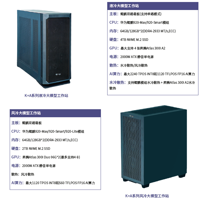 K+A系列塔式AI工作站一體機(jī),基于1路或2路華為鯤鵬920-Max/920-Smart/920-Lite模組構(gòu)建,適配華為昇騰Altas 300I Duo、Atlas 300I A2等高性能NPU,最多可搭配4張全高全長AI計算加速卡。塔式機(jī)箱,靜音設(shè)計,無需專屬機(jī)房,部署靈活,插電即用,算力高和可靠性高等特點,支持大模型本地部署。適用于辦公室、實驗室、研發(fā)空間等日常辦公環(huán)境,提供“開箱即用”的本地化大模型算力平臺,可廣泛應(yīng)用于智慧辦公、智慧金融、教育科研、電子政務(wù)、數(shù)字人等應(yīng)用領(lǐng)域。